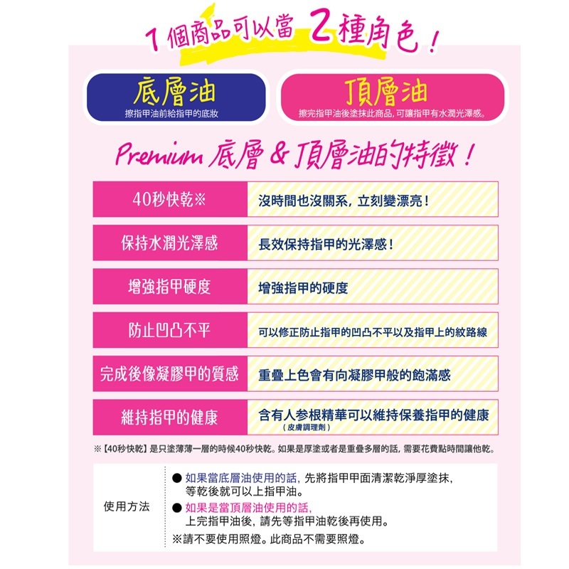 40秒快乾!! 增強指甲硬度,長效保持水潤光澤感。