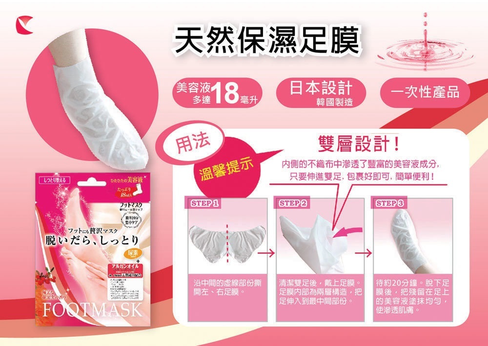 如何使用: 用清水將雙腳徹底洗淨及抺乾,打開包裝,從中間虛線撕開腳膜載上,等待20分鐘左右便可除下。亦可以根據個人需要調整佩載時間,最後把剩餘的精華液均勻地塗抹讓其滲透肌膚。