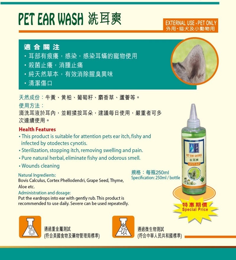 * 耳部有痕癢,感染,感染耳蟎的寵物使用