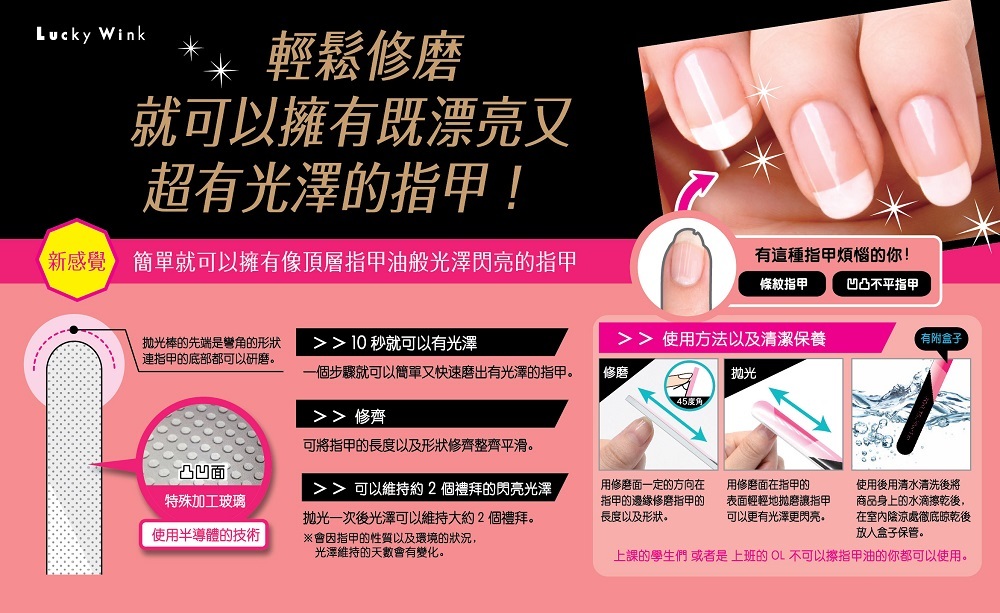 輕微拋光賦予其超光澤的效果。它會像面漆一樣閃亮。銼刀表面採用半導體技術進行特殊處理。 10秒後發光。輕鬆快速地一步打磨出閃亮的指甲。撫平指甲的長度和形狀。拋光後,您的指甲將保持光澤約2週。非常適合學校、辦公室和美甲使用者。
