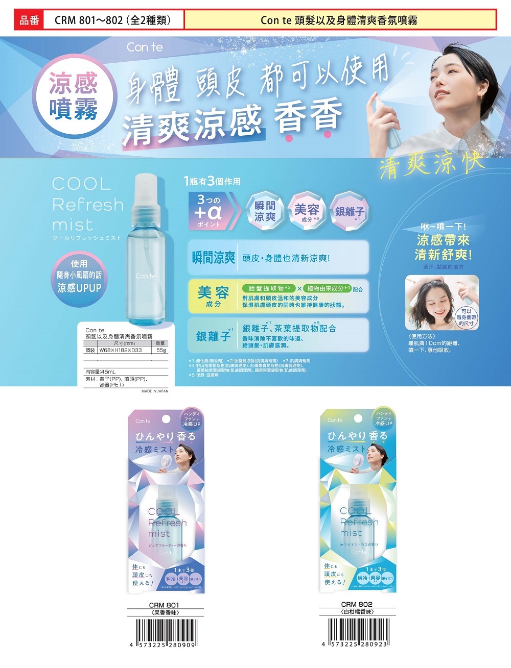 帶有清涼香味的清涼噴霧,可用於身體和頭皮。