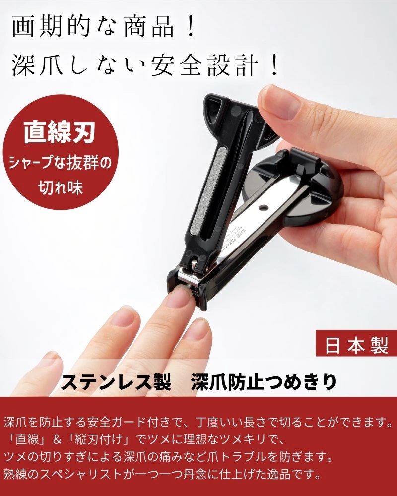 配有安全防護裝置,可防止剪指甲過深,因此您可以將指甲剪至合適的長度。 憑藉其“直線”和“垂直刀片”,它是指甲鉗的理想選擇,可防止因指甲剪過而導致的深指甲疼痛等指甲問題。