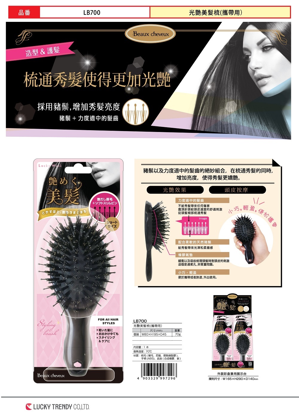 特點: 梳理頭髮同時按摩頭皮,令頭髮更有光澤。