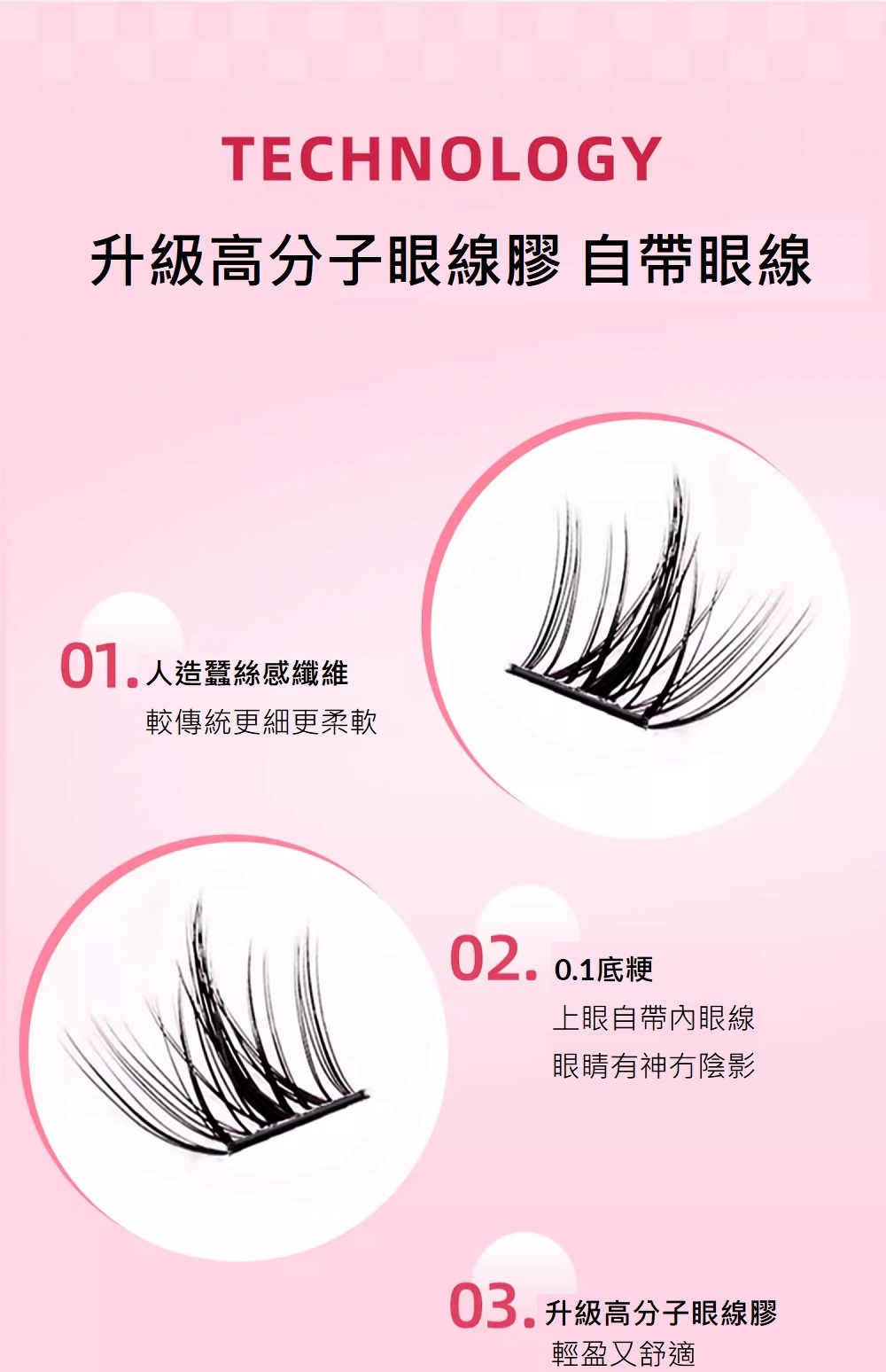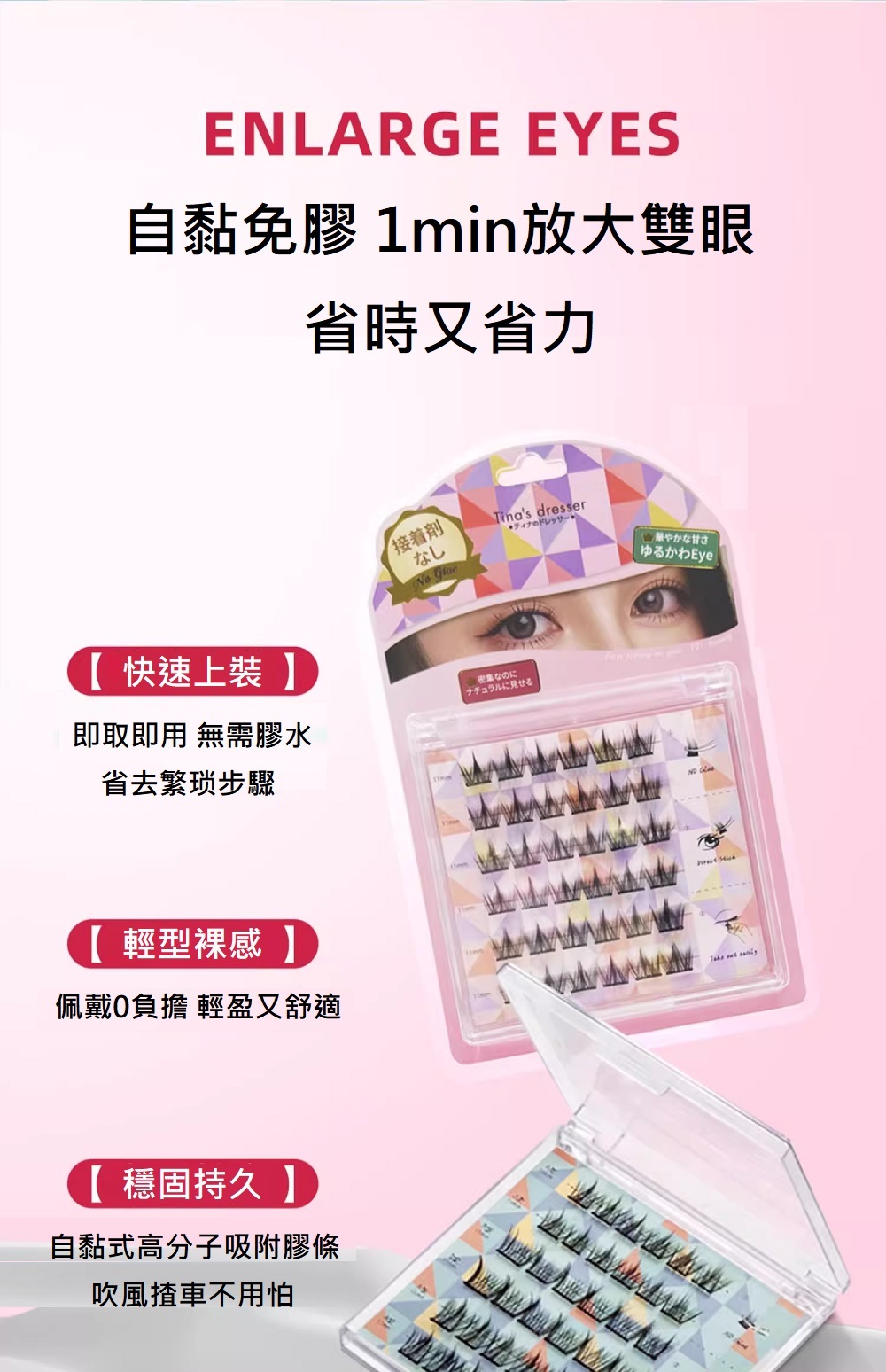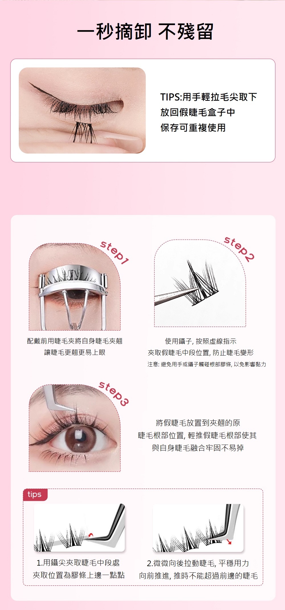 ✓ 無需黏合劑, 只需從內眼角到外眼角依序黏貼即可