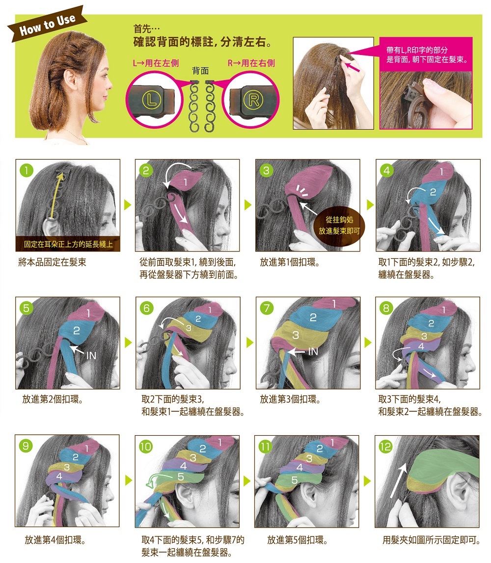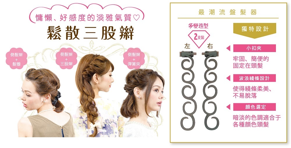 只要將頭髮捲起來放進去即可!功能性髮飾,可打造蓬鬆的側編輪廓。